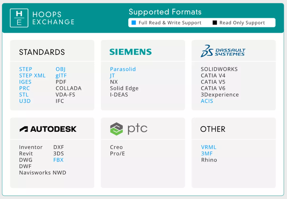 通过高效的C++与C# API接口,HOOPS Exchange可支持导入30+种主流文件格式,包括:CATIA、SOLIDWORKS、Inventor、Creo、NX、Solid Edge、Revit、IFC、DWG等,并可导出为行业标准格式,如:3D PDF、STEP、JT、XT、3D HTML等。