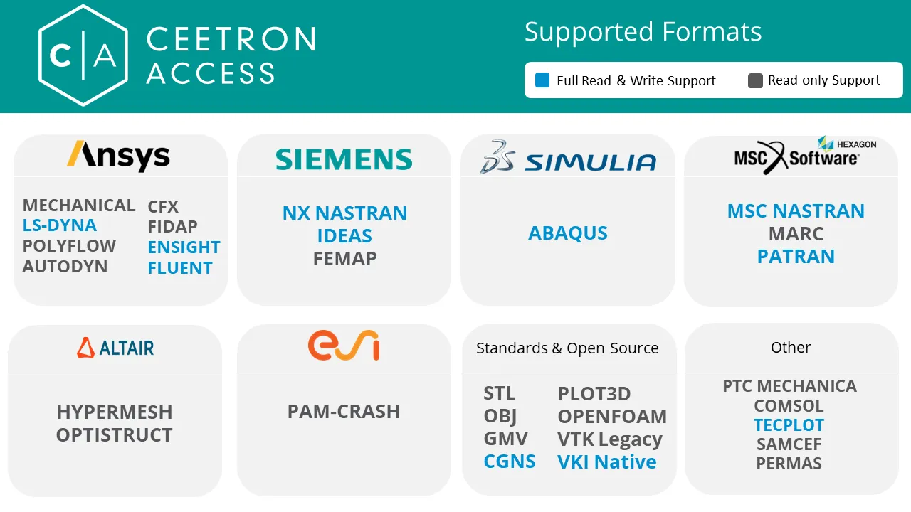 HOOPS Access则为这一问题提供了通用解决方案。作为一款 CAE数据互操作SDK,它支持30多种格式导入,涵盖包括Nastran、Abaqus、ANSYS Fluent、IDEAS、CGNS等主流仿真文件类型。