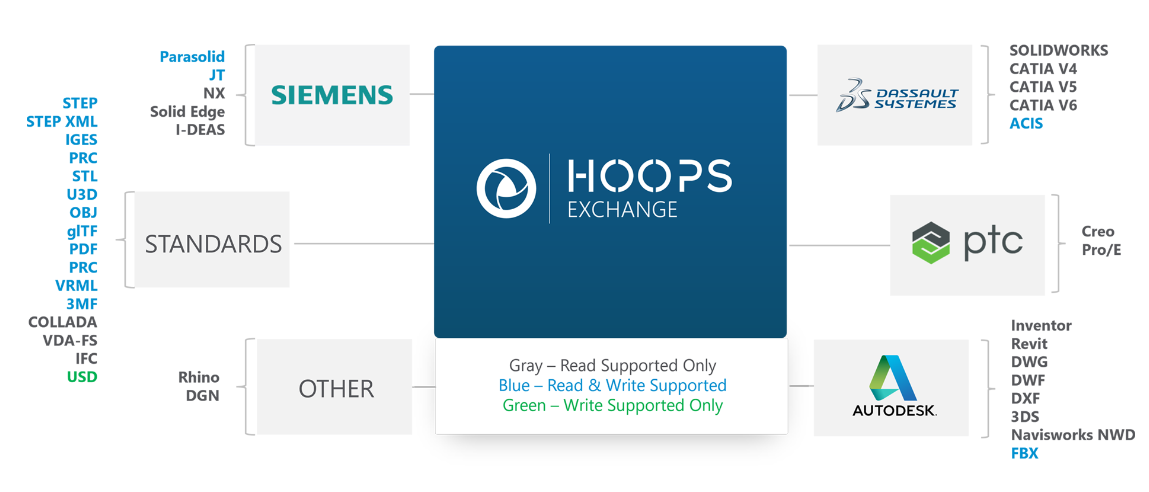 HOOPS Exchange是一款专为三维工程应用开发所设计的软件开发工具包(SDK)。该工具包重点解决工程软件中“访问与重用由CAD/BIM设计工具所生成的三维数据”这一关键需求。通过一个统一的接口,开发者能够从超过30种原生格式及标准格式中导入、适配、再导出3D数据。